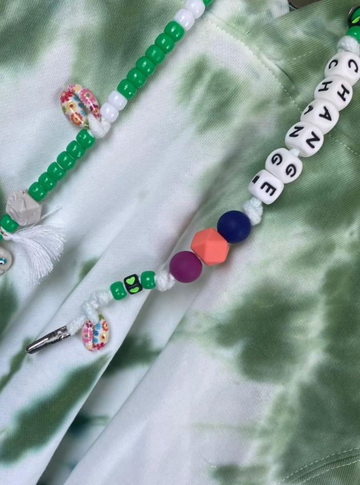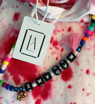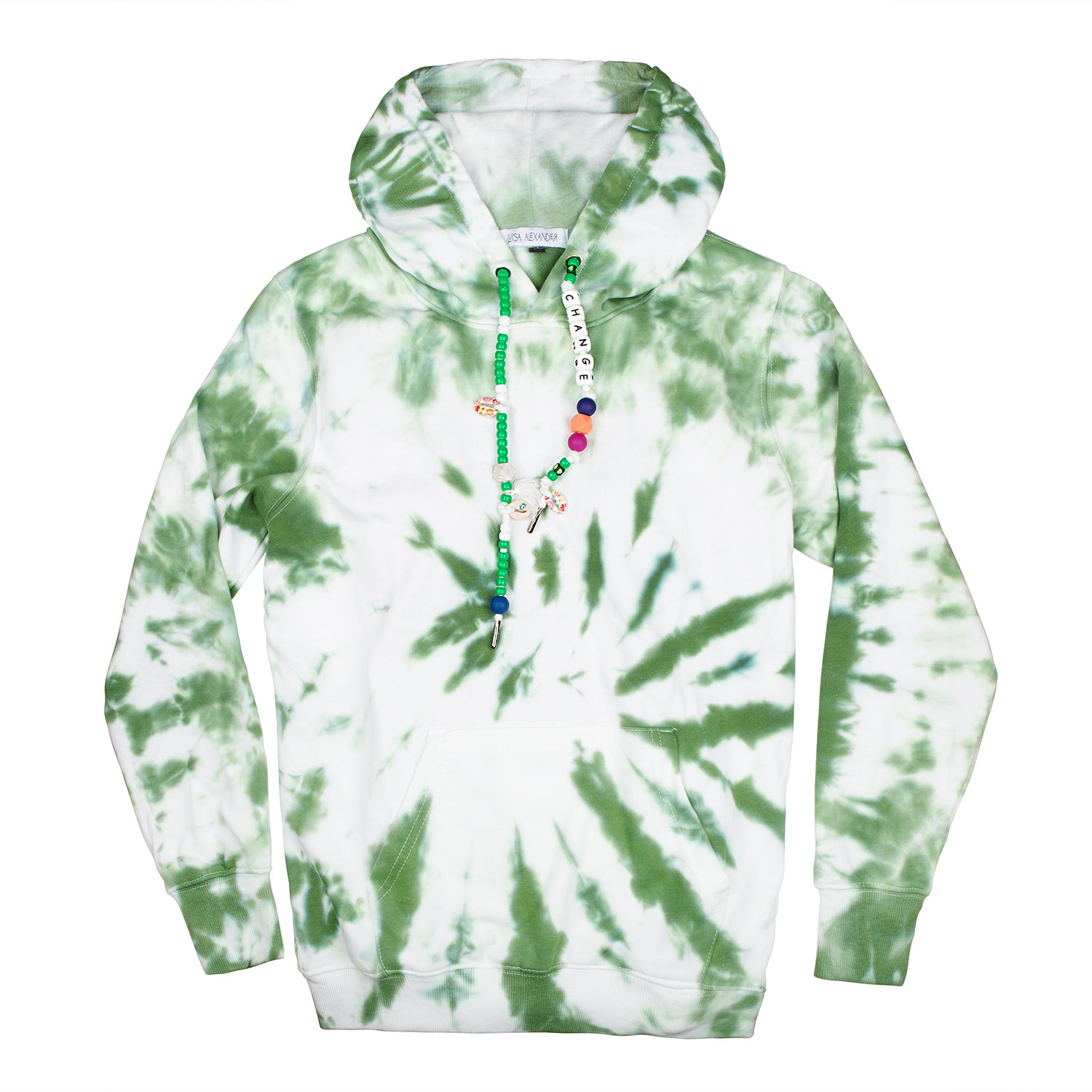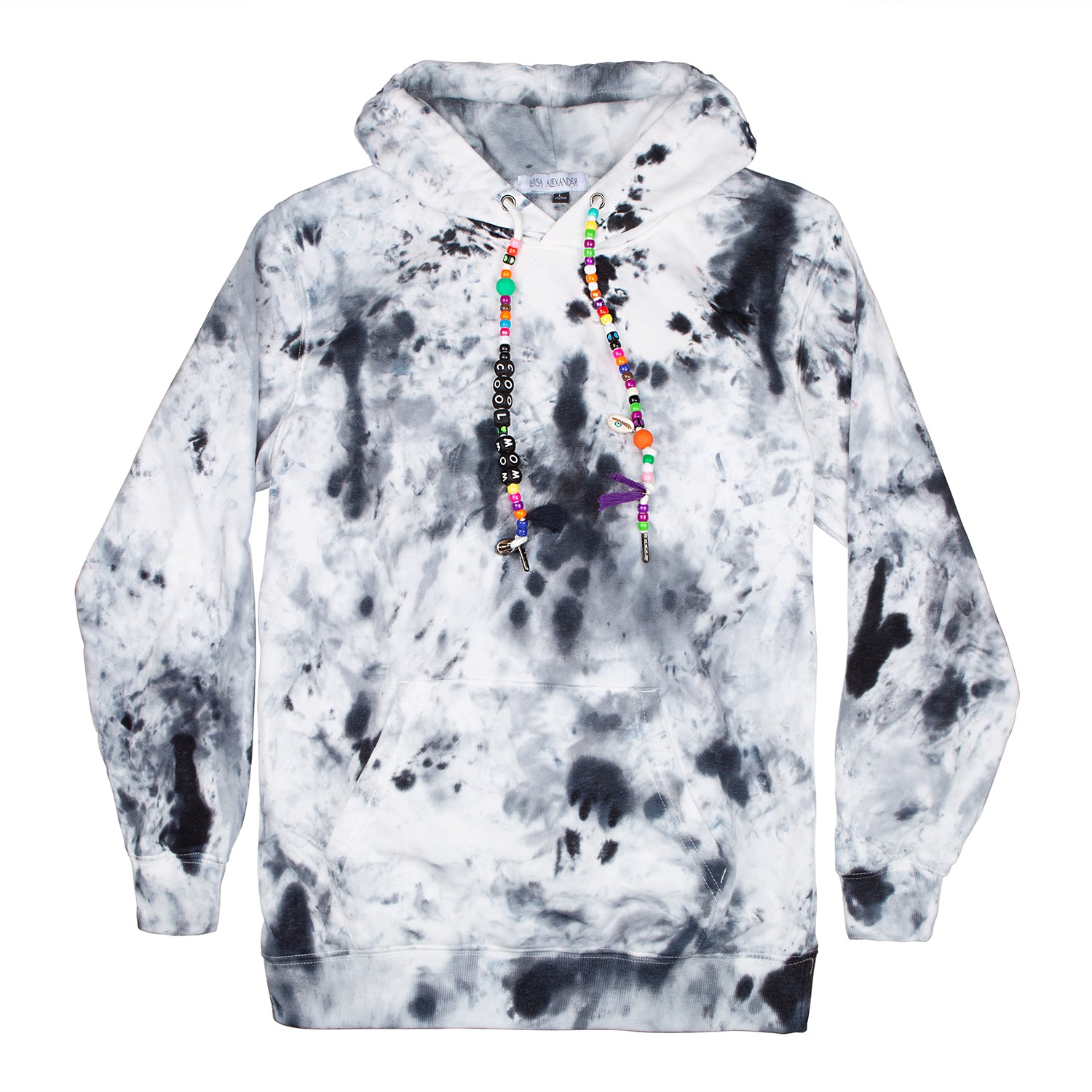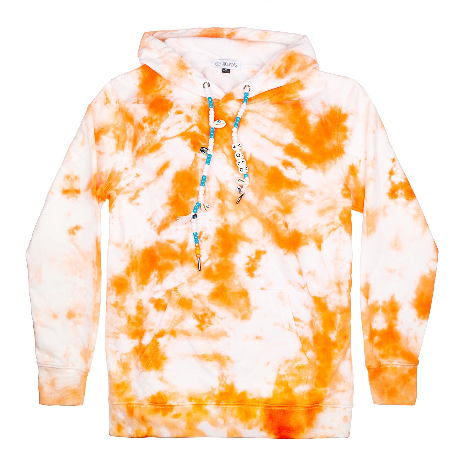 One-of-a-kind tie-dye hoodies designed by us and brought to life by you. In the following fields you may specify what you want your drawstrings to say, and if you’d like to add a single initial patch. Each product is hand-dyed and one-of-a-kind so there will never be two hoodies alike.