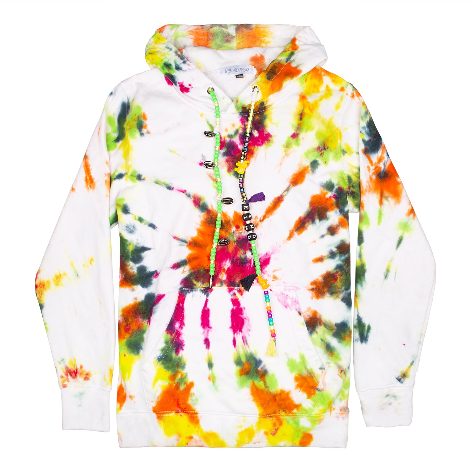 One-of-a-kind tie-dye hoodies designed by us and brought to life by you. In the following fields you may specify what you want your drawstrings to say, and if you’d like to add a single initial patch. Each product is hand-dyed and one-of-a-kind so there will never be two hoodies alike.
