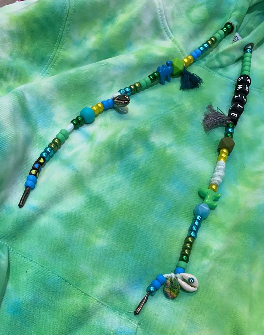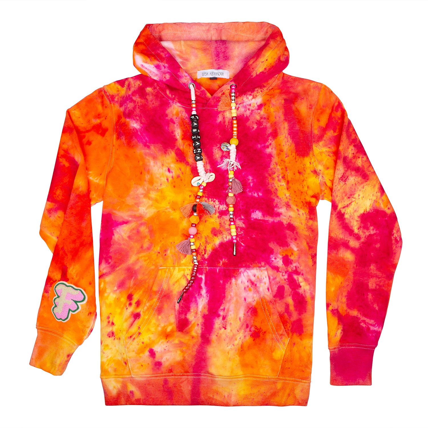 One-of-a-kind tie-dye hoodies designed by us and brought to life by you. In the following fields you may specify what you want your drawstrings to say, and if you’d like to add a single initial patch. Each product is hand-dyed and one-of-a-kind so there will never be two hoodies alike.