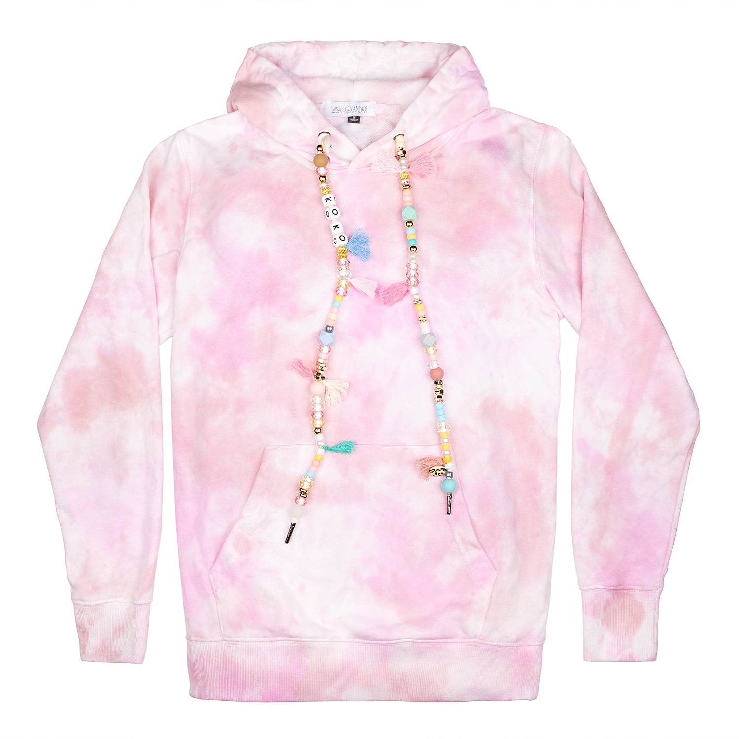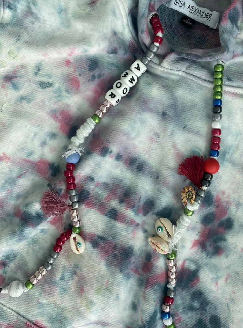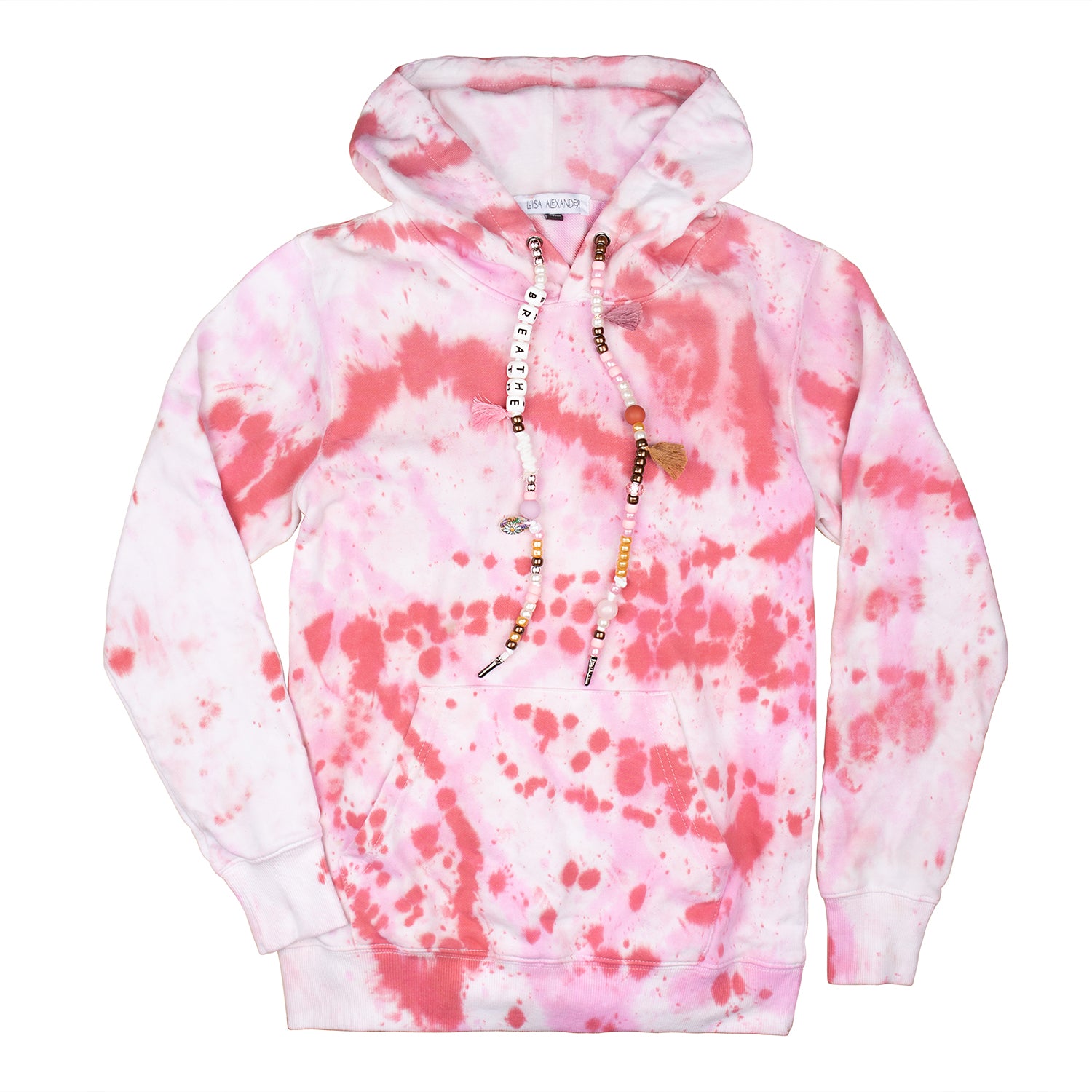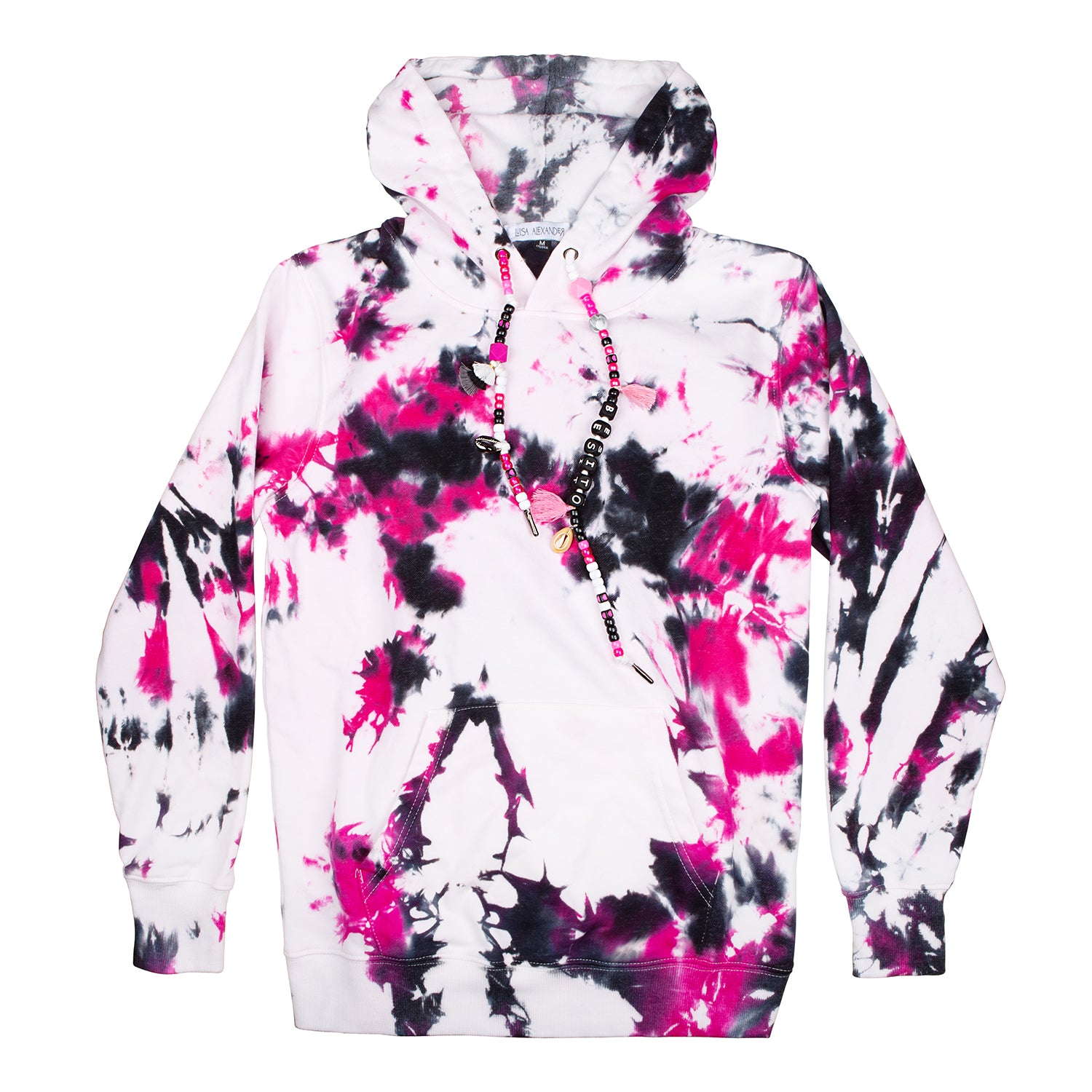 One-of-a-kind tie-dye hoodies designed by us and brought to life by you. In the following fields you may specify what you want your drawstrings to say, and if you’d like to add a single initial patch. Each product is hand-dyed and one-of-a-kind so there will never be two hoodies alike.